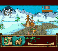 BC Racers is a kart racing game starring characters from the Core Design's Chuck Rock series of games. Each of the racers in this game rides a prehistoric motorcycle with a side car. On each two-character team, one person drives the motorcycle, and the other fights off opponents using clubs, punches, kicks, etc. Graphics in BC Racers consist of a flat landscape decorated with scaled sprites to compose the track and scenery. www.Mobygames.com